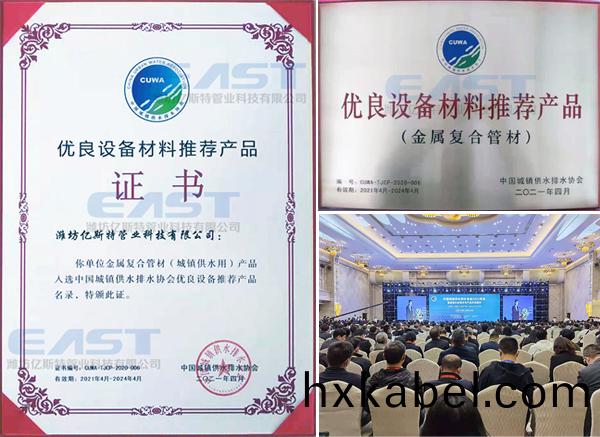 在(zai)本届大(da)会上,中国城(cheng)镇供水排水协会发(fa)布了(le)第一(yi)批(pi)优良(liang)设备(bei)材(cai)料推荐(jian)产品(pin)名单(dan),并(bing)进行(xing)了(le)授(shou)牌(pai)仪式。潍(wei)坊亿斯特(te)管(guan)业科(ke)技有(you)限(xian)公司(si)的TPEP防(fang)腐(fu)钢管(guan)产品凭(ping)借(jie)优良的(de)产(chan)品质量(liang)、使(shi)用(yong)性(xing)能和良好(hao)的(de)品牌(pai)形(xing)象,荣(rong)获(huo)《中国(guo)城镇供(gong)水(shui)排水(shui)协(xie)会(hui)优(you)良(liang)设备材料推(tui)荐产(chan)品》证书(shu)。